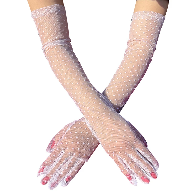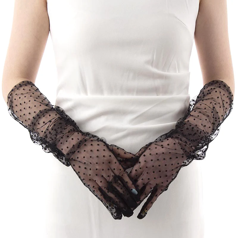 Fashion Sexy Women Black White Dot Lace Long Tulle Gloves Bride Wedding Stretchy Full Finger Transparent Thin Lady Mesh Gloves